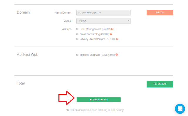 6. Kemudian tampil troli paket hosting dan domain yang kamu sewa. Dengan menggunakan Paket Hemat tadi maka mendapatkan potongan sebesar 20%. Sungguh murah dan hemat sekali jika dibandingkan yang lain. Untuk melengkapi proses pemesaran, silakan Log In. Jika belum memiliki akun, silakan mendaftar terlebih dahulu dengan klik tombol Daftar. Jika sudah langsung Sign In.