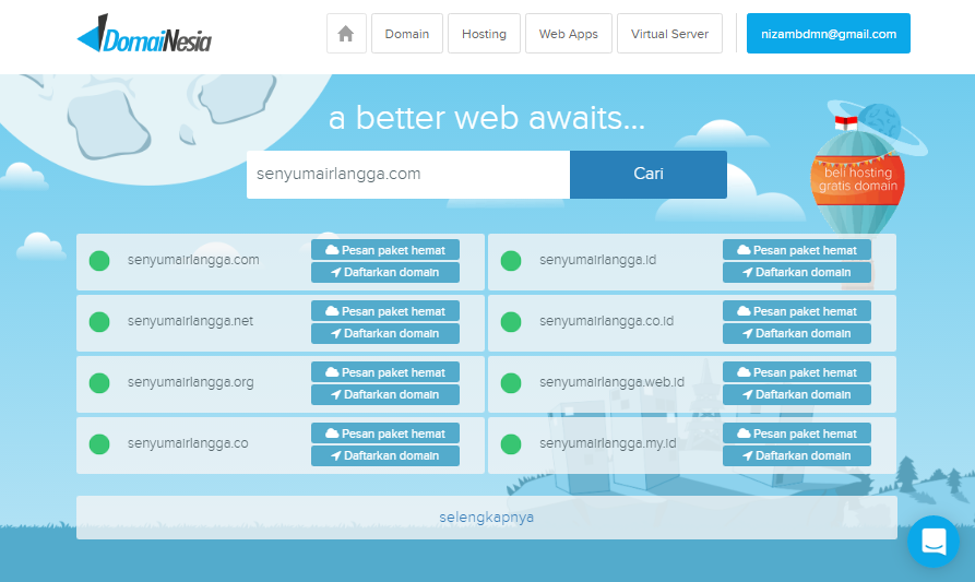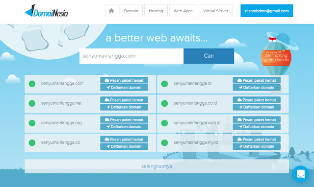 Banyak di luar sana yang menawarkan domain dan hosting murah, namun saya sekali tidak tergiur dengan hal itu. Kebanyakan dari penjual domain murah tersebut kabur sehingga sulit dihubungi ketika akan perpanjangan domain, bahkan belum ada satu tahun domain sudah expired. Hal tersebut banyak dialami beberapa teman blogger saya. Pada akhirnya, tidak dapat memperpanjang domainnya. Sungguh sangat disayangkan, padahal blog tersebut sudah punya reputasi bagus di mata google, SERP (Search Engine Result Page), dan punya ranking Alexa bagus tapi sudah tinggal nama saja karena tidak bisa perpanjang domain. Oleh karena itu, saya memilih seller domain yang pasti murah dan pasti aman dimana lagi kalau bukan di DomaiNesia.